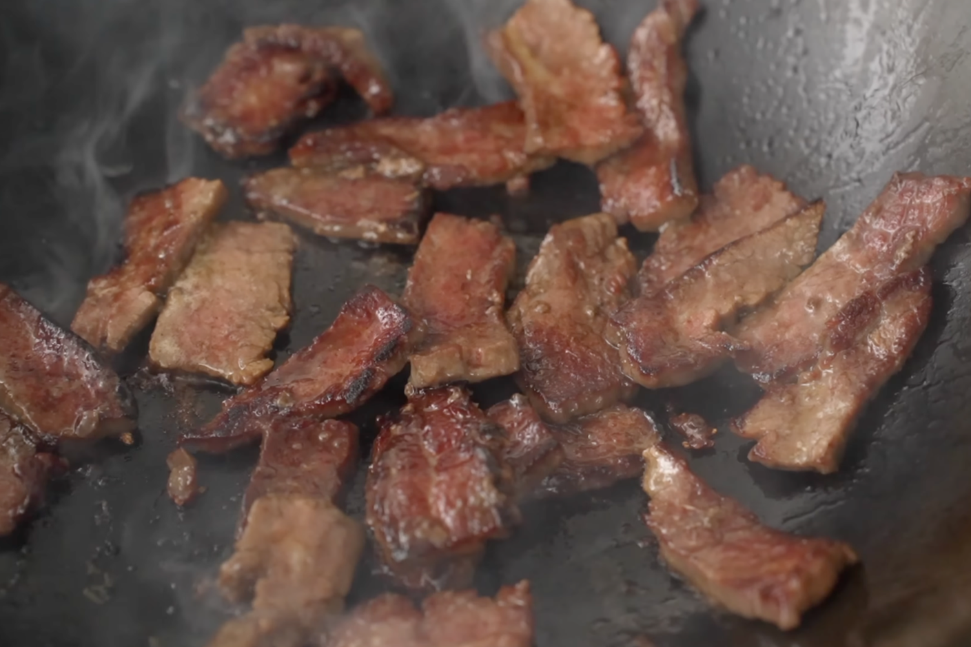 In a seasoned wok, sear half of the beef off on one side until dark brown, flip and cook for another 10 seconds and set aside. Repeat the process with the rest of the beef.