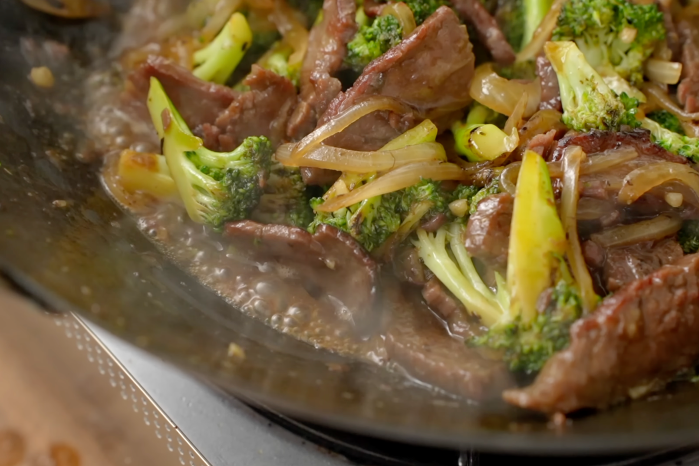 Into the wok add in all of the beef and broccoli and stir fry for about 15-20 seconds until everything is mixed together. Add in stir fry sauce, mix and bring to a boil. Add in cornstarch slurry and toss for another 20 seconds. Remove from the heat and serve with rice.
