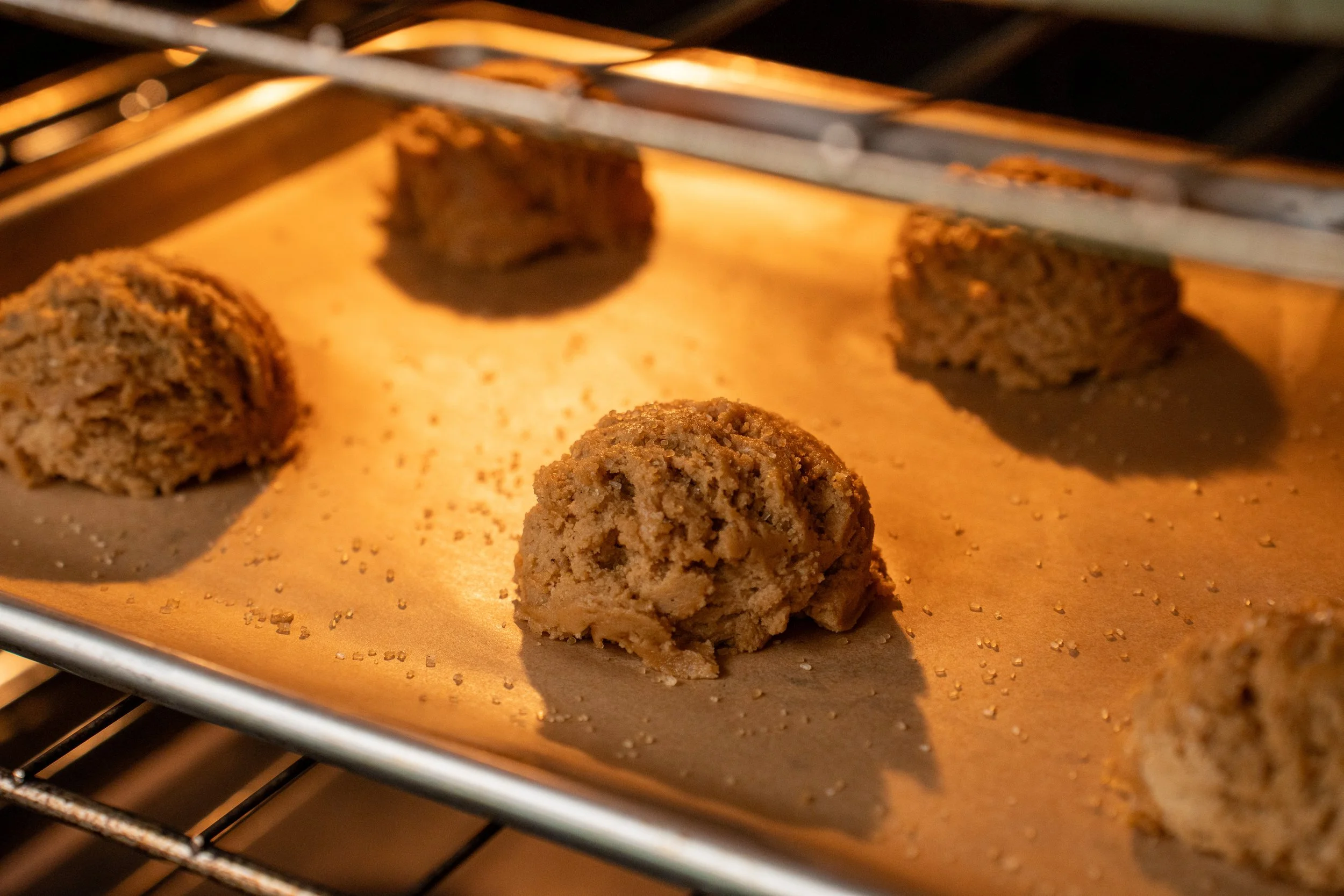 9. Sprinkle on a generous pinch of raw or demerara sugar into the top of each dough ball. This adds crunch and sparkle to the finished cookie. I did not say this in the video for this recipe but it’s a VERY nice touch. It turns up the volume just a little bit more. Its like listening to Huey Lewis’s “I Want a New Drug” ….Louder is better.