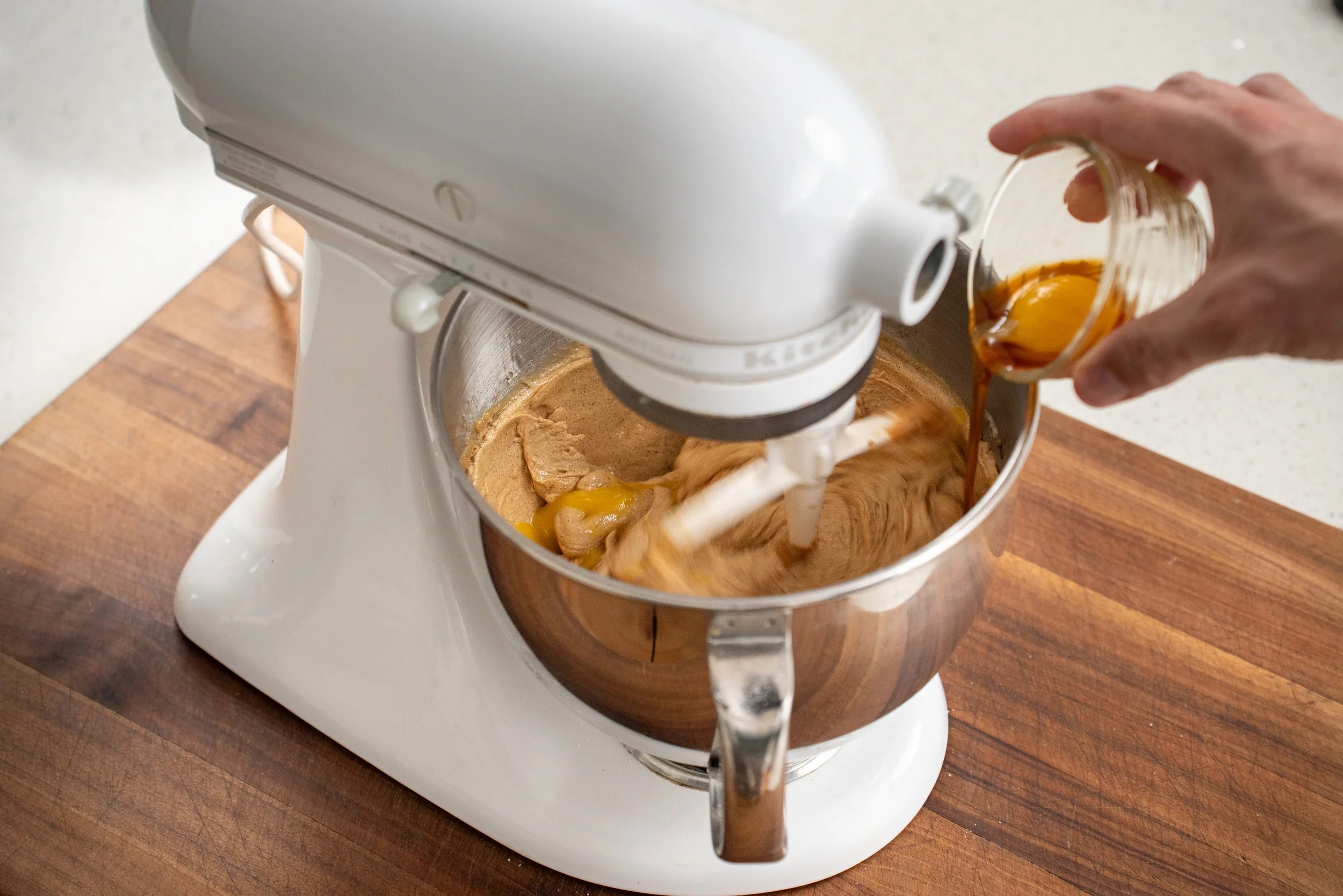 4. Once the dough is homogenous and a light brown color, stream in the eggs and vanilla while the paddle spins on low speed. Mix until things are just incorporated. Again we don't want to overwhip the dough, and once the eggs are in the whites will start to hold a lot of air.