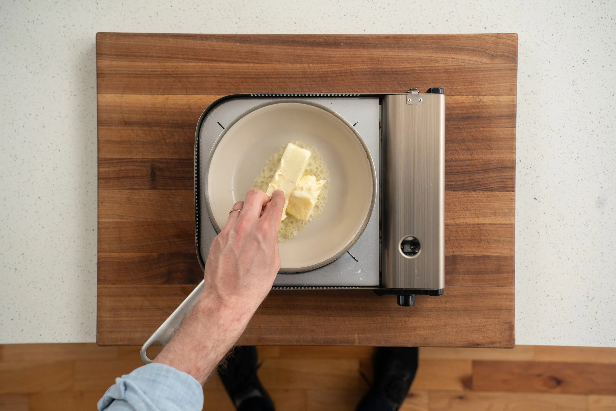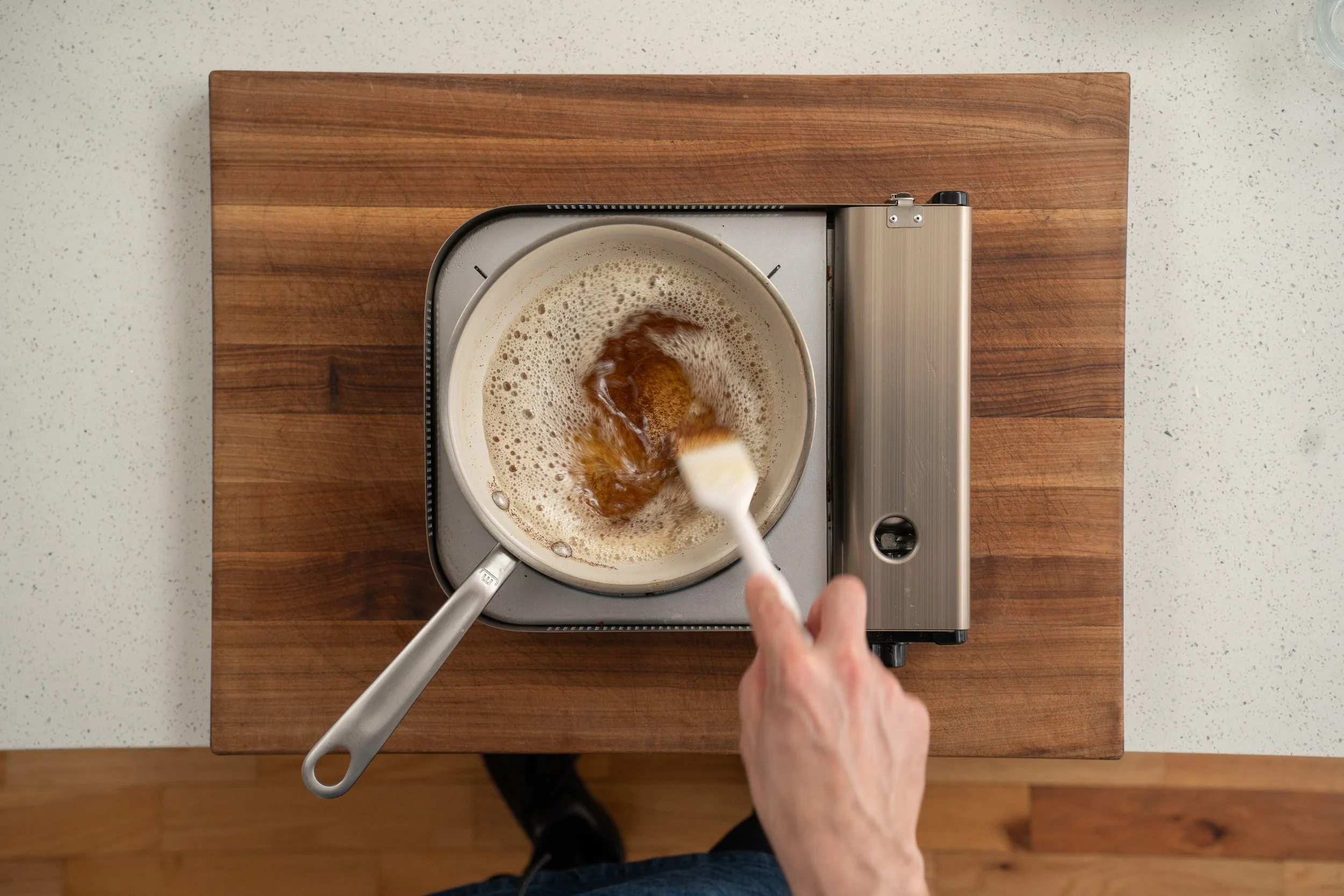 1. Brown the butter. Melt 145g butter in a small saucepan over medium heat and cook, stirring frequently, until the bubbling subsides, the milk solids turn deep amber, and it smells incredibly nutty — Over medium low heat this should take 4-5 minutes.