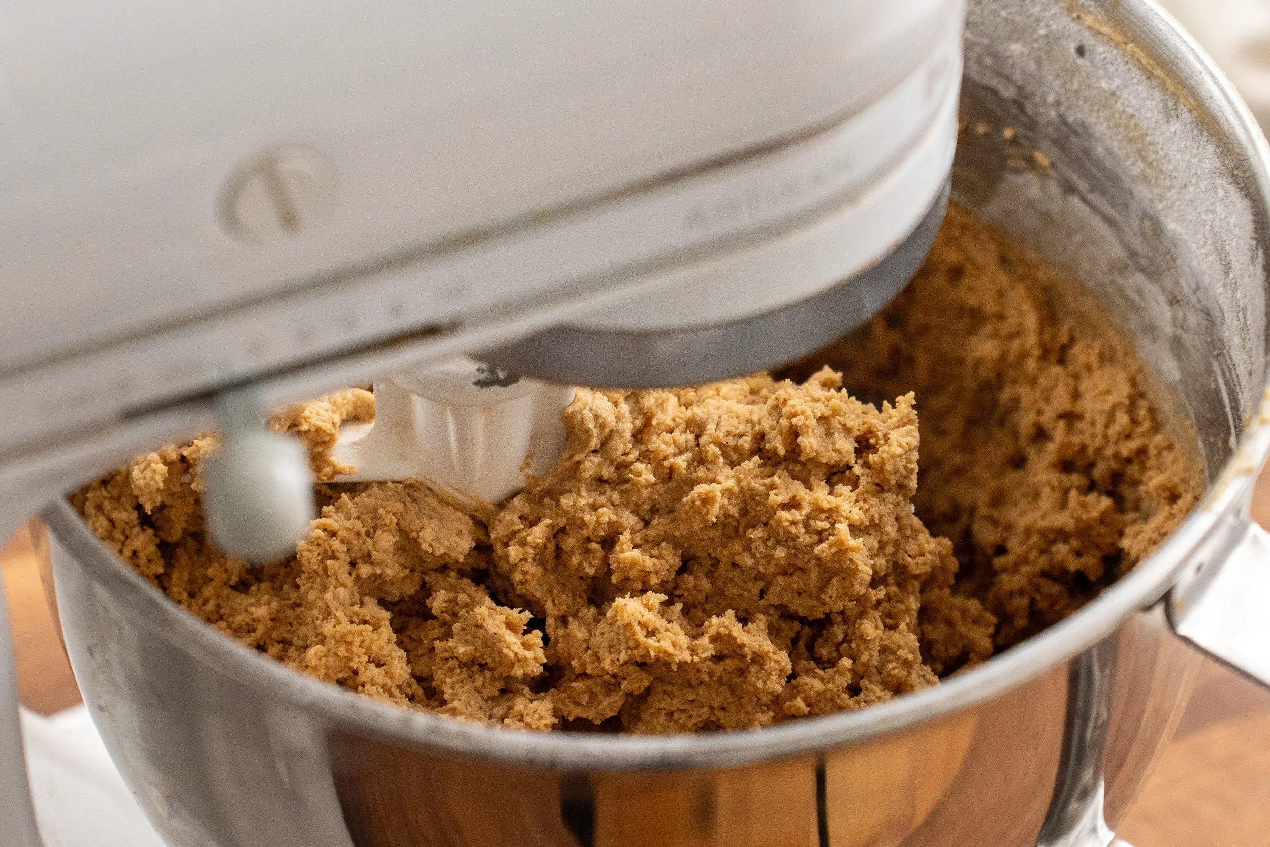 No over-mixing - After adding the dry ingredients to the wet ingredients in the mixer, stop mixing as soon as you no longer see dry flour. The moment AP flour hydrates, gluten starts forming. If you continue mixing, the cookie will become tough and have a bread-like chew instead of a tender bite. The starch in the flour is just here to bind things together. The moment AP flour hydrates, gluten starts forming, and if you continue mixing, the cookie will become tough and have a bread-like chew instead of a tender bite. The starch in the flour is just here to bind things together.