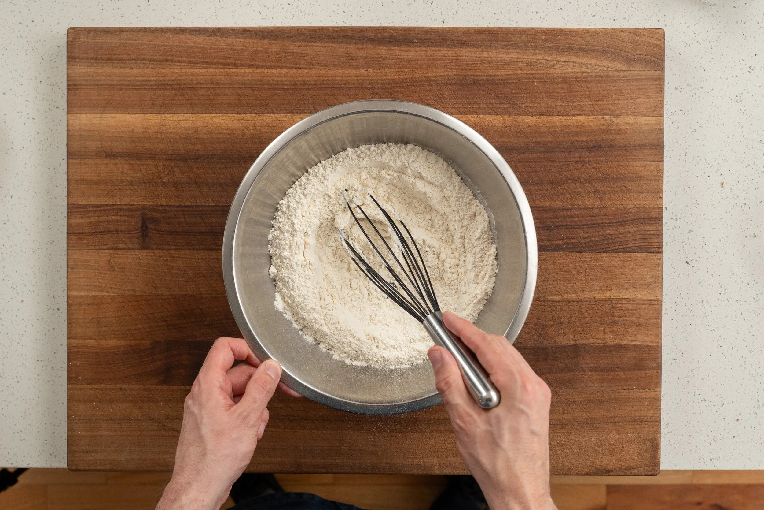 5. In a medium bowl, whisk together the flour, baking powder, baking soda, and salt. This ensures even distribution — a localized clump of unmixed baking soda or salt will ruin a cookie.