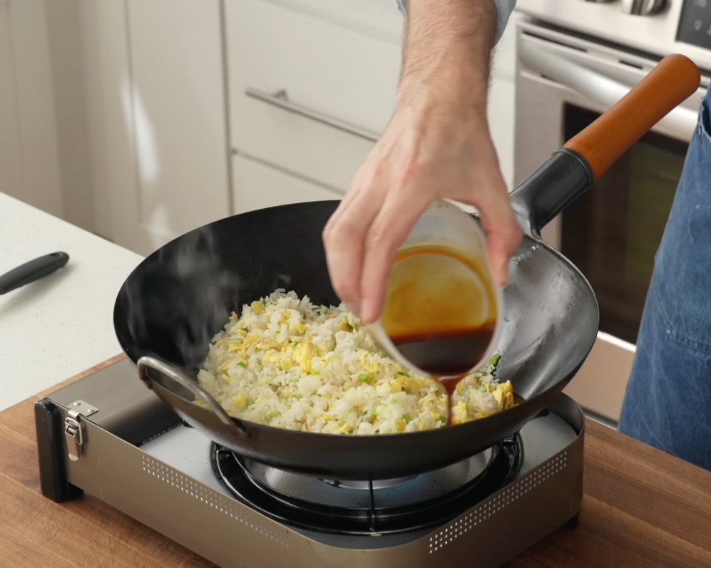 Push the rice into the center of the wok, into a single mound. Pour the soy sauce mixture around the edge of the rice and toss until incorporated. Stir in remaining green onion. Season to taste if needed