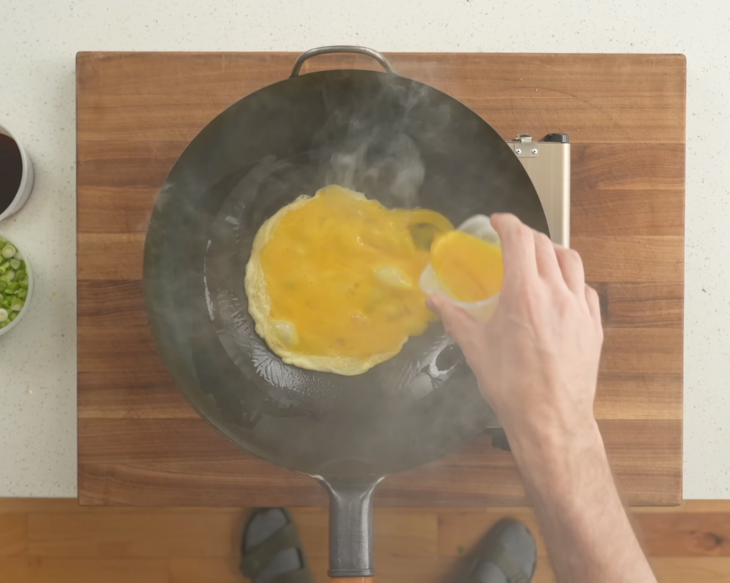 Heat up about 2 Tbsp of oil until slightly smoking. Add in eggs and allot to puff up for about 15 seconds. Flip the eggs and break down slightly and cook for about another 10 seconds. Set aside.