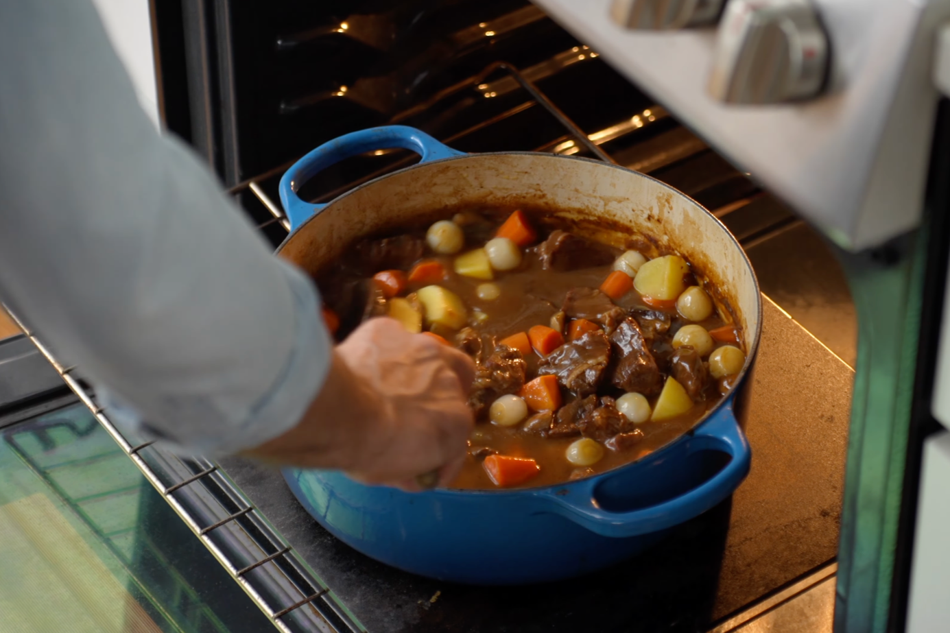 Add beef stock and beer. Bring to a simmer, stirring and scraping frequently. When simmering, add in beef. Add a splash of water to the beef cooking tray, scraping up beef fond. Add to pot with beef. Stir to combine. Load pot, uncovered, into 300F/150C oven and cook for 2 hours, stirring halfway through.